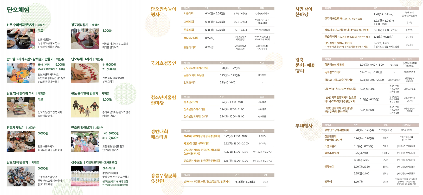 창포머리감기, 관노 종이인형 만들기, 단오빔 입어보기, 전통차 맛보기, 단오 뱃지 만들기 등 다양한 단오체험존을 운영합니다.