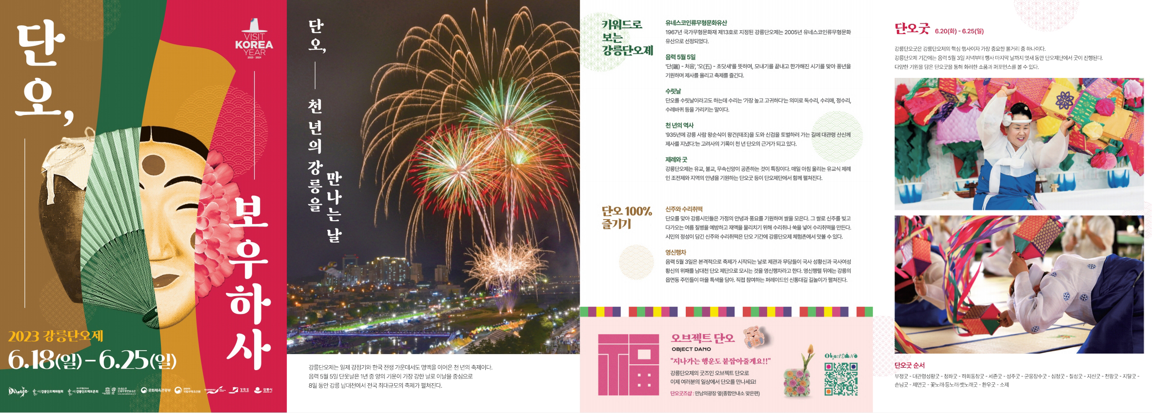 단오, 보우하사 2023 강릉단오제는 보우란 "보살피어 도오주다"라는 뜻으로 액을 막고 복을 기원하는 강릉단오제를 통해 모두가 안전하고 편안한 일상을 누렸으면 하는 바람의 의미를 가지고 있다고 합니다. 천년 역사를 지닌 강릉단오제를 보살피고 이어나가 한국의 전통을 지켜나가고자 하는 의지를 내포하고 있으며 이렇게 멋지고 의미있는 행사를 통해서 행사에 참여하는 시민들에게 의미있고 기억에 남는 행사가 되었으면 좋겠습니다.
