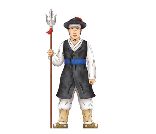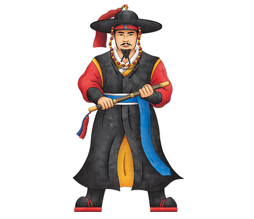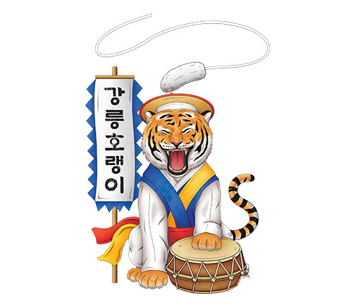 | 강릉대도호부관아를 대표하는 인물입니다. 굳건한 모습으로 강릉문화재야행을 안전하게 수호하고 성황리에 진행하겠다는 의지의 모습을 담았습니다. | 강릉을 수호하는 동물 호랑이를 귀여운 악사로 표현해 북을 치는 모습으로 행복과 풍요로움이 널리 울려 퍼지길 바라는 염원을 담았습니다. |