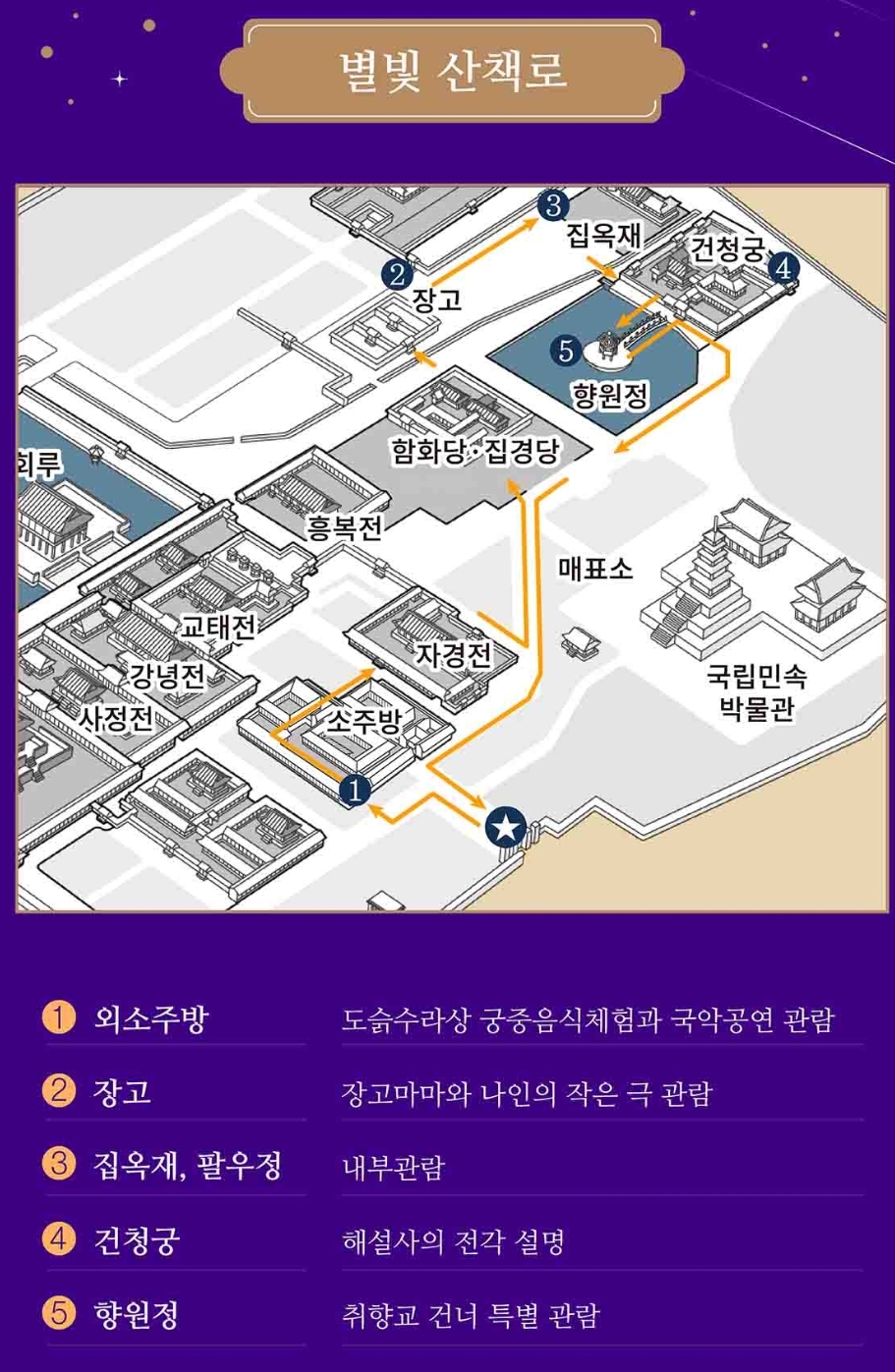 경복궁의 가장 깊은곳인 북측 권역의 문이 열립니다. 외소주방에서 궁중음식체험과 전통 공연을 즐기고, 전문 해설사와 함께 별빛 산책을 떠나보세요.