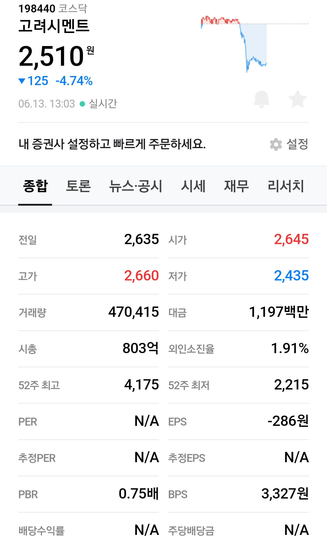 생산 중단 소식에 고려시멘트가 전일 거래일보다 4.74% 내린 2510원에 거래되고 있다.