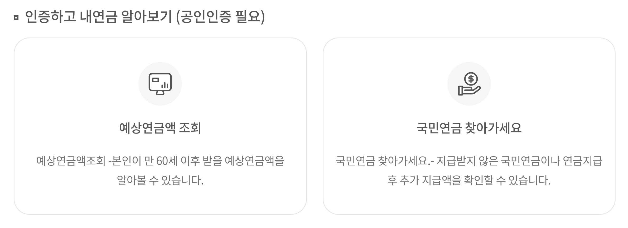 이때 받으시는 연금액은 본인의 가입기간 및 가입 중 평균소득액, 전체 가입자의 평균소득액을 기초로 계산됩니다. 자세한 사항은 국민연금 홈페이지(내 연금 알아보기) 또는 모바일 앱「내 곁에 국민연금」에서 예상연금액을 조회하시어 향후 받게 될 금액을 확인하실 수 있습니다. (본인 인증 필요)