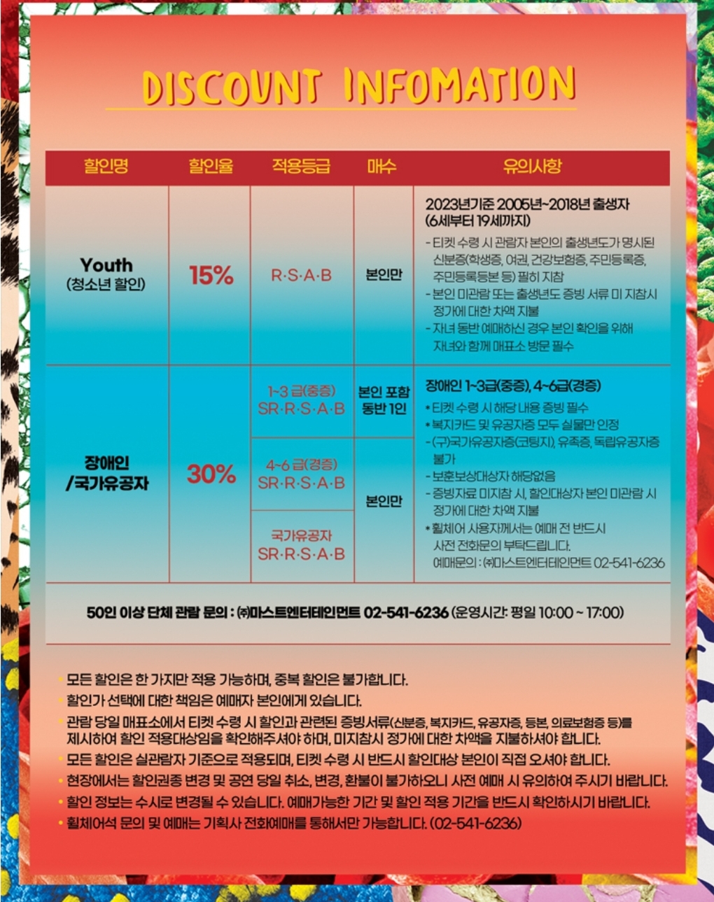 | * 적용회차 : 10/25(수) ~ 11/12(일) * 예매방법 : 좌석선택 > 할인선택 후 결재, 타 할인과 중복 불가 * 유의사항 : 티켓수령 시 가족관계증명서, 등본, 의료보험증, 가족사진 등(가족임을 증명할 서류 지참) |