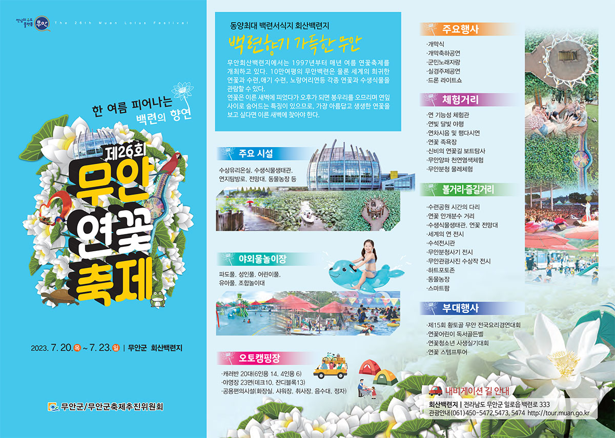 | 체험행사 | 연빛 달빛 야행, 연차시음행사, 연꽃 족욕장체험, 무안양파 천연염색체험 등 |