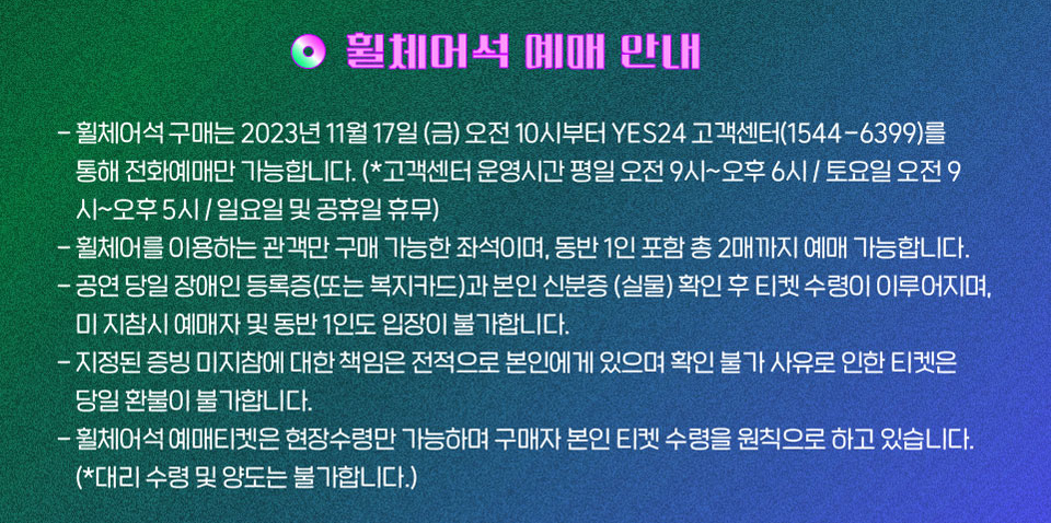 ● 예매하신 티켓을 현장수령 하시는 경우 대리 수령은 불가능하며, 공연 당일 현장 매표소에서 "예매자 신분증"과 "예매 내역서" 지참 후, 티켓을 수령하시기 바랍니다.