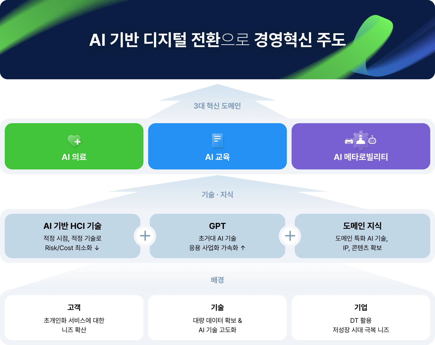 인공지능 기반 기술에 대한 경쟁력 확보와 함께 도메인별 특화 데이터를 통해 AI응용 제품을 사용화하는데 주력하고 있습니다. 특히 의료제이터, 건강검진 데이터, 문진 데이터, 체력증정 데이터, 콜센터 데이터 등 도메인별 특화 데이터를 활용하여 고객이 원하는 제품을 제공함으로써 인공지능 시장을 선도해 나가고 있습니다.