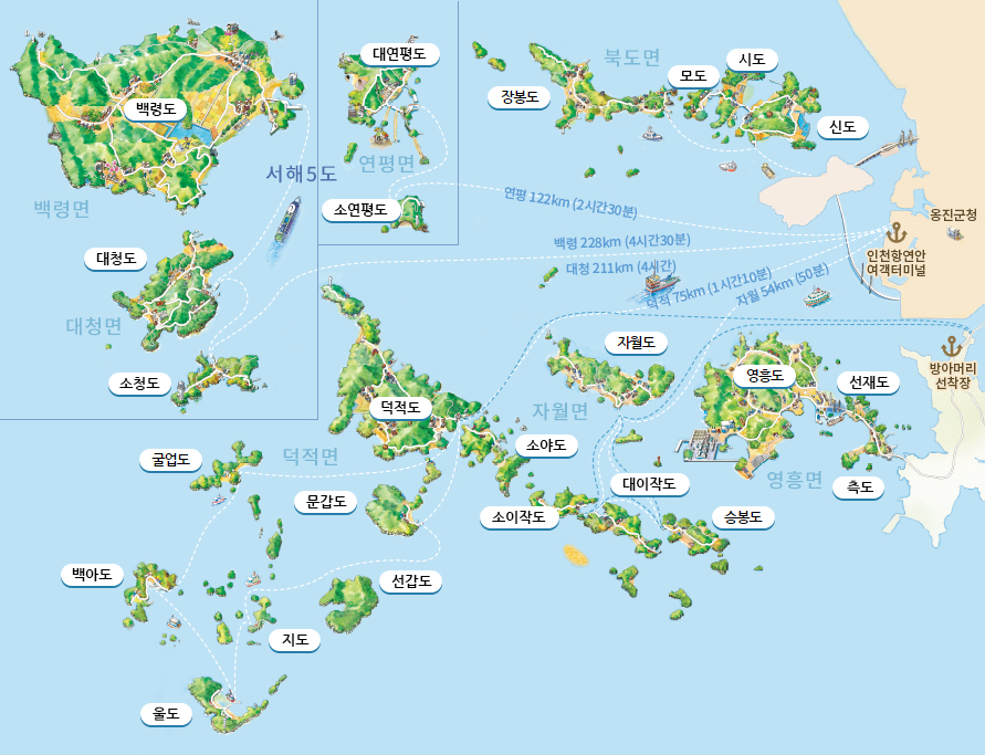 옹진군 사업대상 섬은 신시모도(신도, 시도, 모도), 장봉도, 덕적도, 소야도, 백령도, 대청도, 자월도, 소이작도, 승봉도, 소야도, 연평도 등 총 12개 섬입니다. 강화군 섬은 볼음도와 주문도 2개로 총 14개 섬에서 운영됩니다.