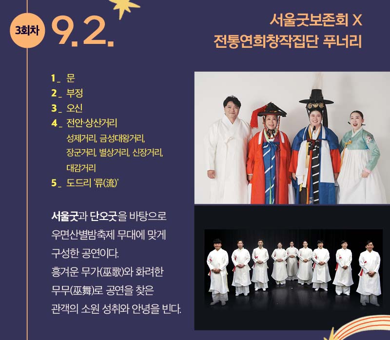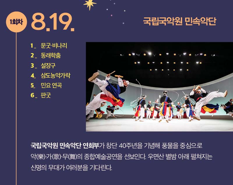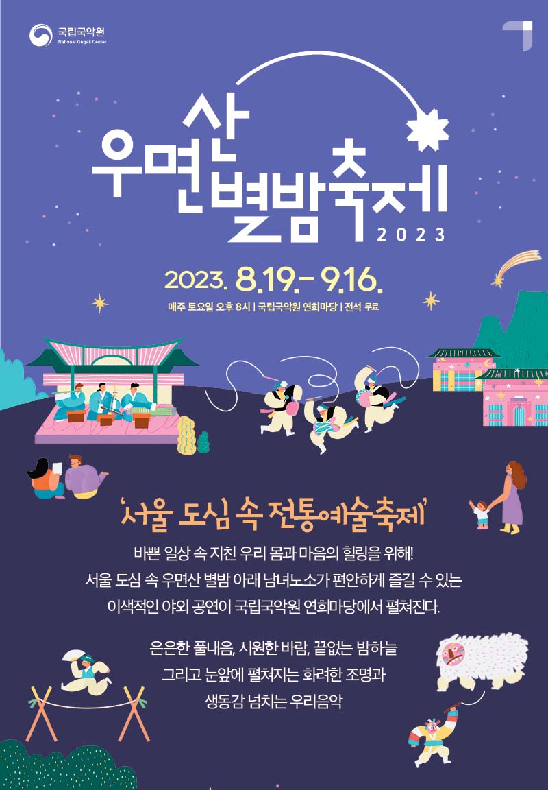 서울 도심 속 전통예술제입니다. 바쁜 일상 속 지친 우리 몸과 마음의 힐링을 위해 편안하게 즐길 수 있는 이색적인 야외 공연이 국립국악원 연희마당에서 펼쳐집니다.