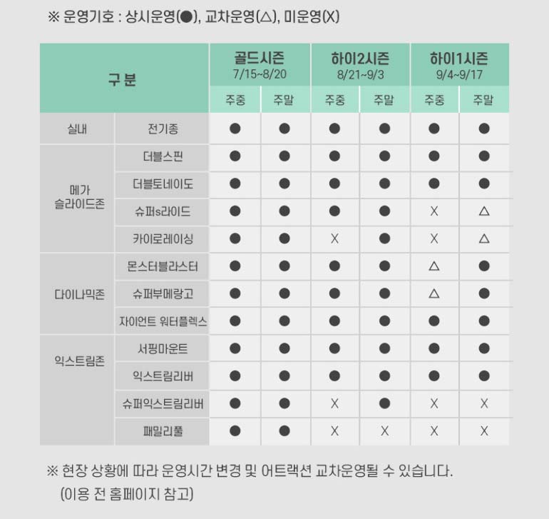 다양한 어트랙션 : 실내존, 메가슬라이드존, 다이나믹존, 익스트림존 오픈(어트랙션별 운영일정은 홈페이지 참고)