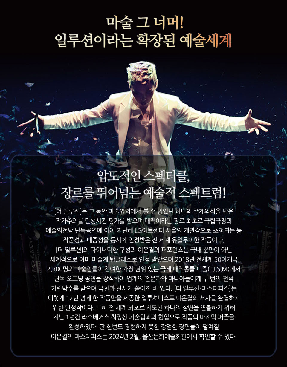 국내 최초, 국내 유일, 국내최다 그랑프리 수상이라는 영예와 함께 국내 최초로 라스베거스 공연을 비롯한 전 세계를 무대로 활동한 한국을 대표하는 매지션이자 "일루션"이라는 새로운 장르를 개척한 일루셔니스트 이은결.