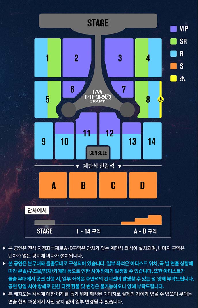 - 휠체어석(장애인석) 예매는 인터파크 티켓 고객센터(1544-1555) 또는 임영웅 전국투어 전용 ARS 고객센터(1660-1646)를 통해 전화 예매로만 가능합니다.(운영시간 : 09:00 ~ 18:00)