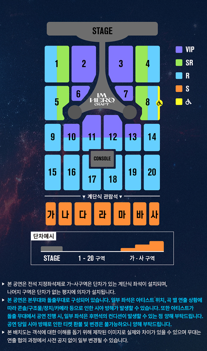 - 휠체어석(장애인석) 예매는 인터파크 티켓 고객센터(1544-1555) 또는 임영웅 전국투어 전용 ARS 고객센터(1660-1646)를 통해 전화 예매로만 가능합니다.(운영시간 : 09:00 ~ 18:00)