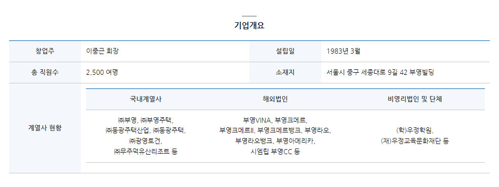 부영그룹은 편안하고 행복한 보금자리를 제공하고 사회발전에 이바지 하는데 역량을 집중해 왔으며, 내실 있고 투명한 경영을 통해 지속적인 성장을 이뤄 현재에는 명실공히 국내 굴지의 종합건설회사로 확고한 입지를 구축했다.