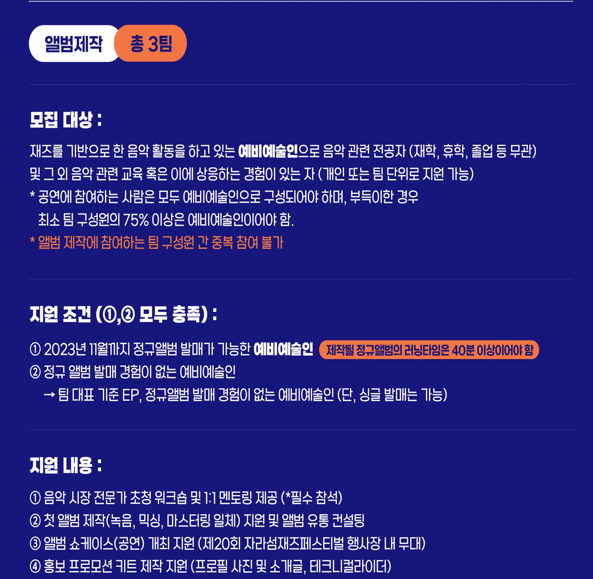 그리고 이번 프로젝트를 통해서 발굴된 멋진 예비예술인들의 공연 "제 20회 자라섬재즈페티벌 "이 2023.10.07(토) ~ 2023.10.09(월) 에 개최된다고 합니다. 많은 관심 부탁드립니다.