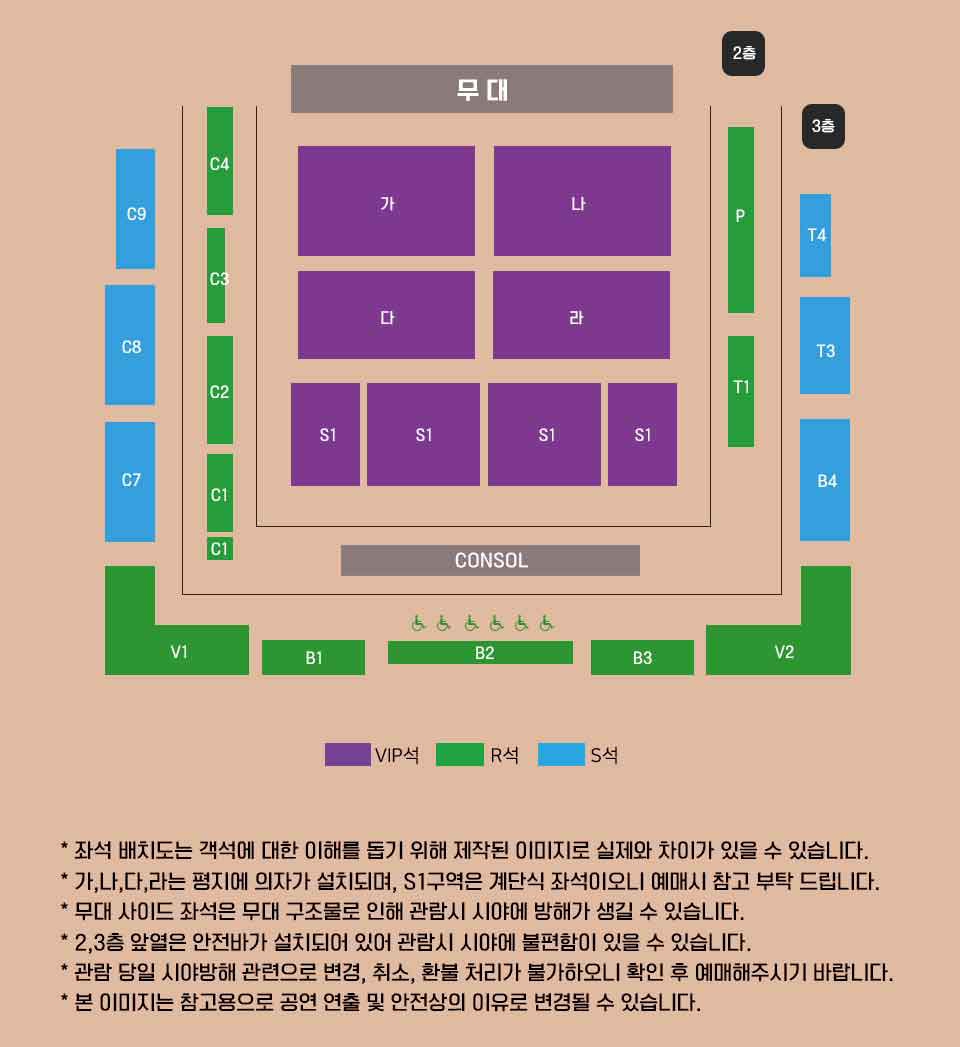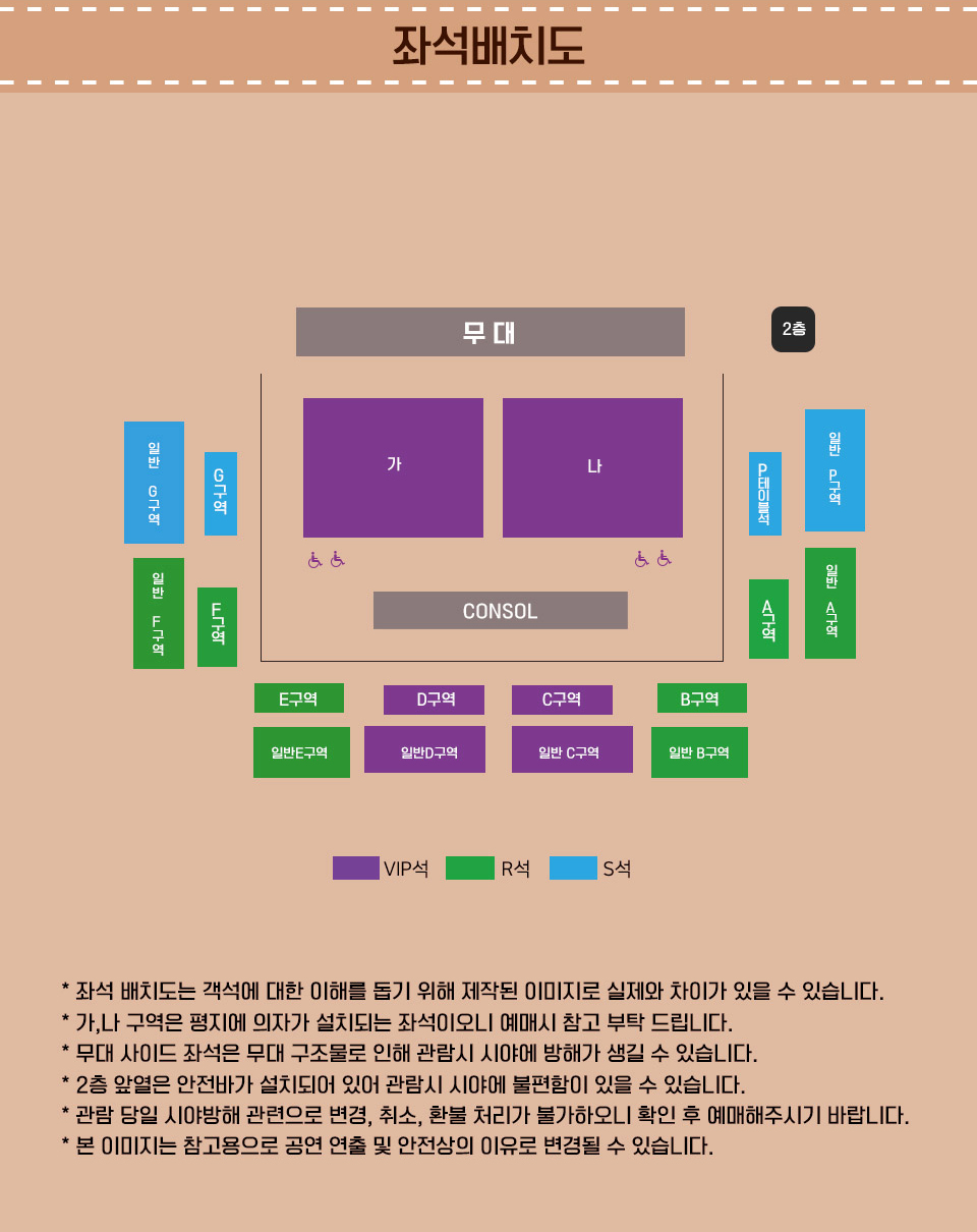 ※ 휠체어석 예매 : 예매처 전화 예매(1544-6399)로만 가능하며, 죄석은 현장에서 지정됩니다. 공연 당일 현장에서 본인 복지카드 확인 후 수령 가능하며 증빙서류 미지참시 현장에서 차액 지불 후 티켓 수령 가능합니다.