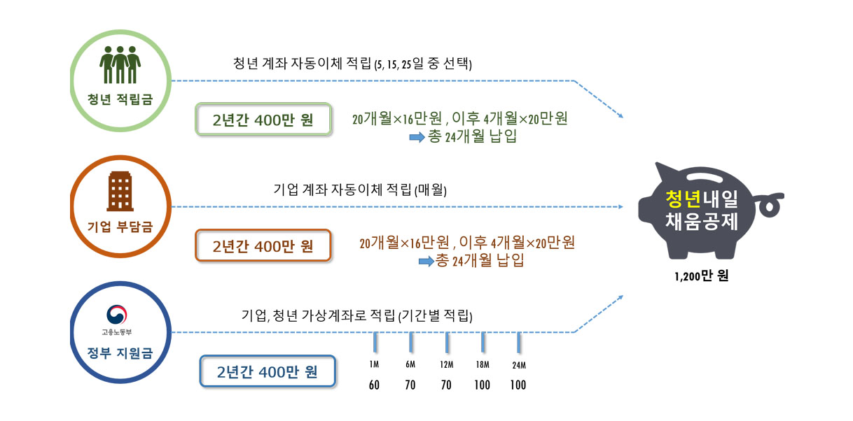 ○ 청년 본인이 2년간 400만원(20개월간 16만원, 이후 4개월간 20만원)을 적립하면 기업(400만원)과 정부(400만원)가 공동 적립, 2년 후 만기 공제금 12,00만원+α 를 지원