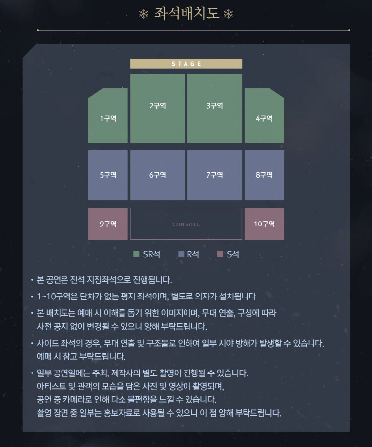 - 휠체어석(보행 보조 의료기 포함)은 극장 및 객석 구조에 따른 안내와 상담을 위해 인터파크 고객센터(1544-1555)를 통해서 예매가 가능합니다.(운영시간 평일/주말 09:00 ~ 18:00)